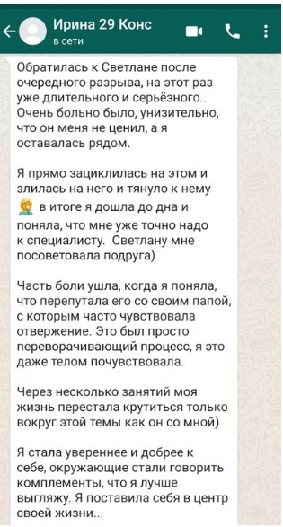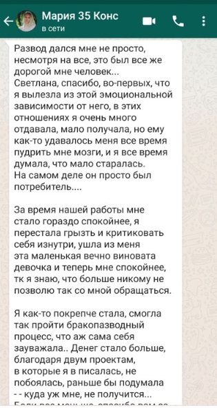 Отзывы можно почитать здесь.Цены на психологическую помощь при разводе или разрыве отношений:✔Консультация по скайпу, вотсапу 6000 час. Длительность в среднем 1,5 часа. Второй час ни в какую сторону не округляется, считается в зависимости от прошедшего времени.